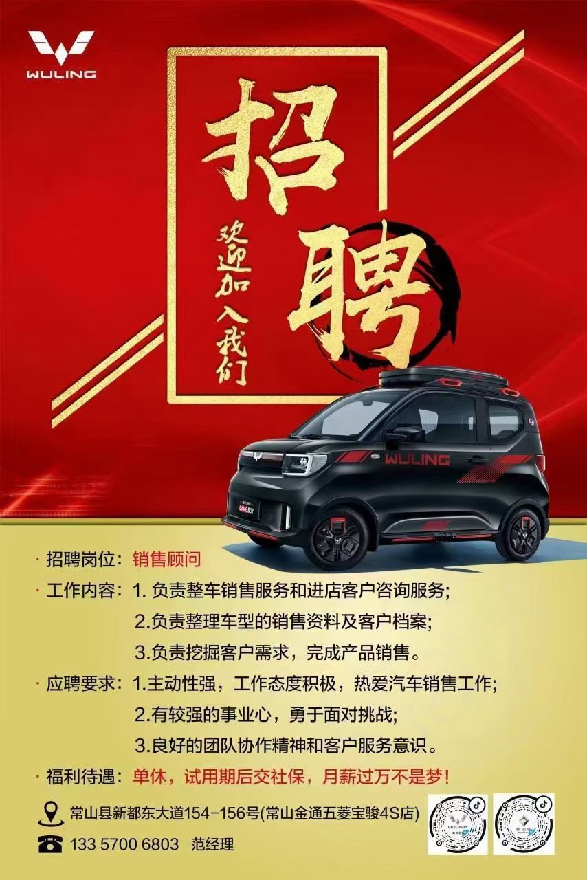 常山金通五菱店招聘销售一名,年龄38岁以内,男女不限 要求:有驾照,性格开朗热情,有一定的销售经验。 待遇:待遇6000以上,工作稳定交五险 地 址:常山金川街道新都东大道154号五菱汽车 联系人:范雪良 电 话:13625703520 (联系电话可以直接点击拨打) 常山信息网提醒你:本信息由用户自行发布,真实性等未验证,请您小心交易,二手交易牢记见货付款!网站业务联系:662686