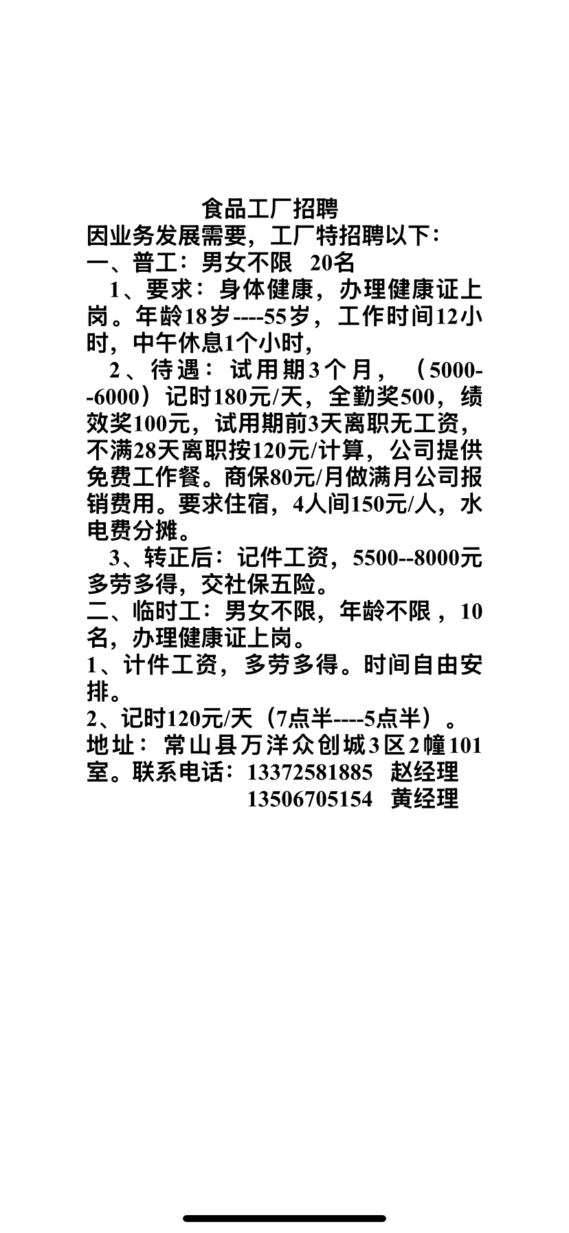 年龄18-55岁 男女均可 身体健康需办理健康证上岗 工作时间12个小时 中午休息一小时 转正后计件工资5500-8000元 多劳多得 交五险 联系人:黄 电 话:13506705154 (联系电话可以直接点击拨打) 常山信息网提醒你:本信息由用户自行发布,真实性等未验证,请您小心交易,二手交易牢记见货付款!网站业务联系:662686