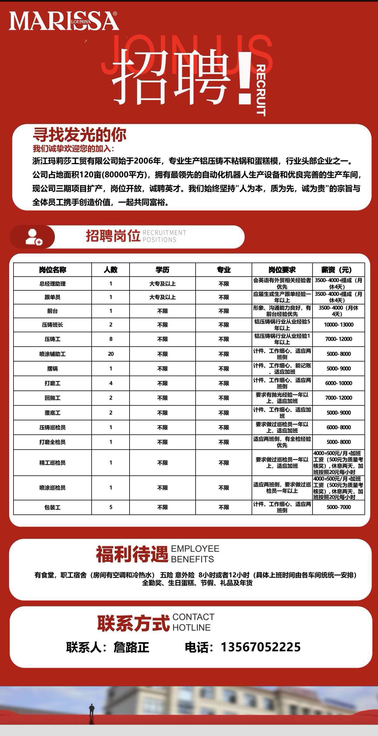 详见招聘海报 地 址:常山县辉埠新区恒泰路131号 电 话:13567052225 短 号:512225 (联系电话可以直接点击拨打) 常山信息网提醒你:本信息由用户自行发布,真实性等未验证,请您小心交易,二手交易牢记见货付款!网站业务联系:662686